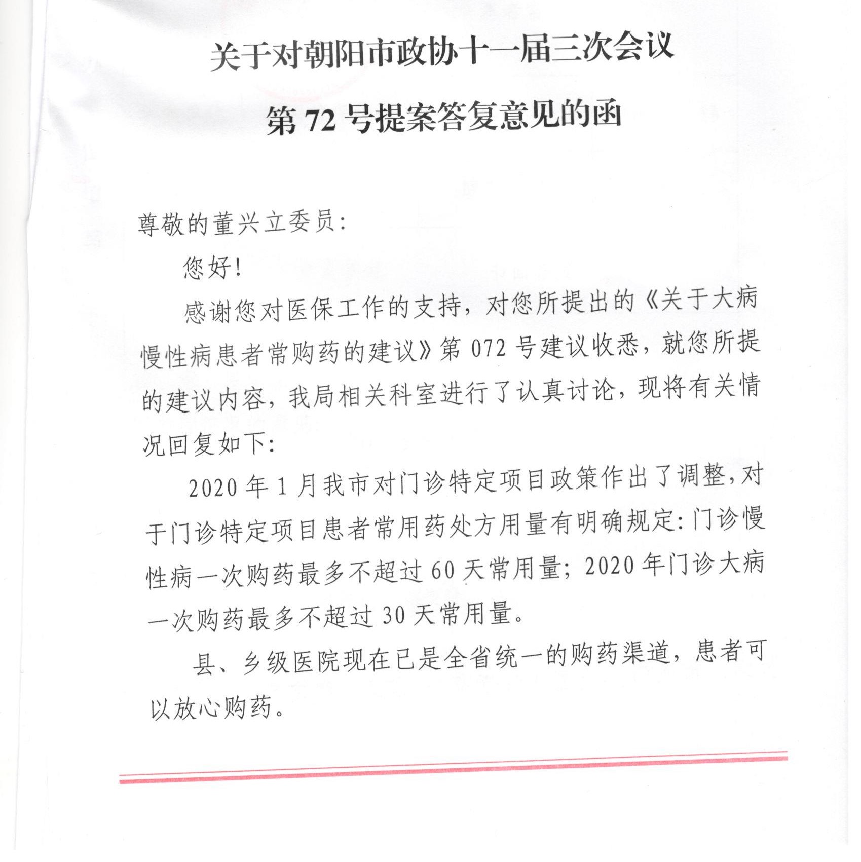 关于对朝阳市政协十一届三次会议第72号提案答复意见的函